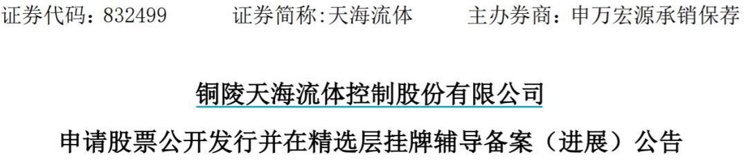 公告显示,天海流体于2021年8月17日向安徽省证监局提交了向不特定合格投资者公开发行股票并在精选层辅导备案登记材料,公司已与申万宏源证券承销保荐有限责任公司签署了《辅导协议》。