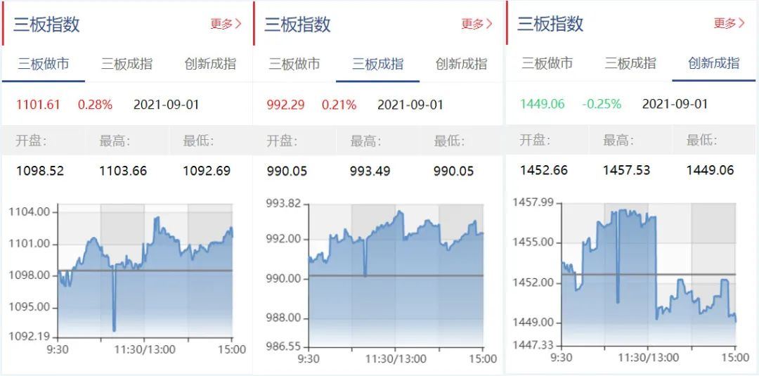 截至9月1日收盘,三板做市报1101.61点,上涨0.28%;三板成指报992.29点,上涨0.21%;三板创新报1449.06点,下跌0.25%。