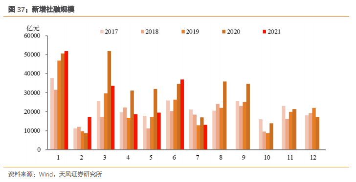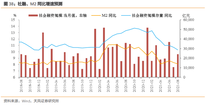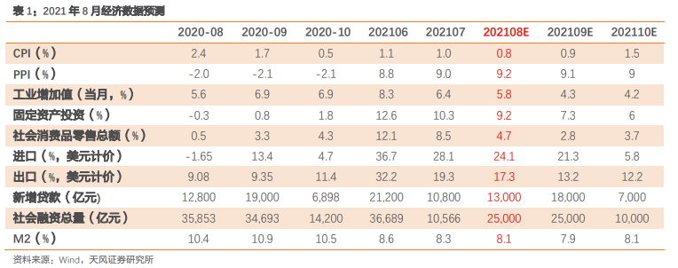 综合来看,我们预计2021年8月新增社融2.5万亿,较去年同期3.58万亿有所回落(其中主要拖累是贷款和政府债券),社融增速预计回落至10.3%。