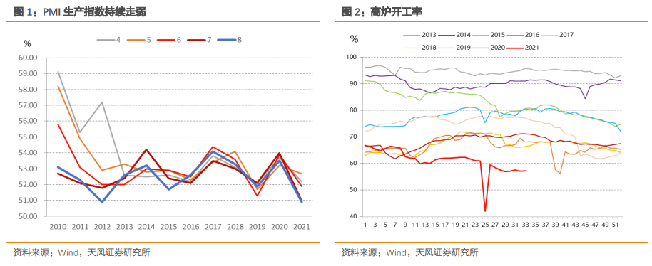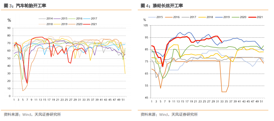 8月PMI生产指数回落0.1个百分点至50.9%,但回落斜率有所放缓,采购量和进口指数也有一定程度降低。从高频数据看,各行业高频数据有所分化,高炉开工率、涤纶长丝开工率略有回落;汽车全轮胎开工率均值比7月略有回升,但未来走势仍不乐观。8月经济扰动因素较多,其中影响最大的在于疫情反复,以及破除无效供给政策集中释放,原材料供应及产品交付不及时,生产周期延长[1]。
