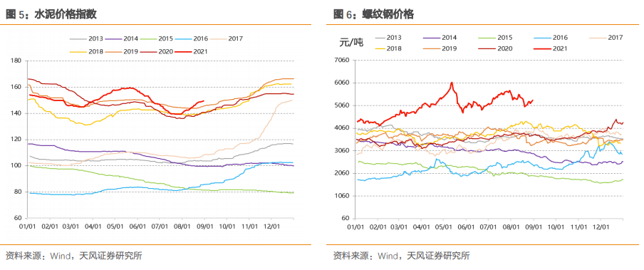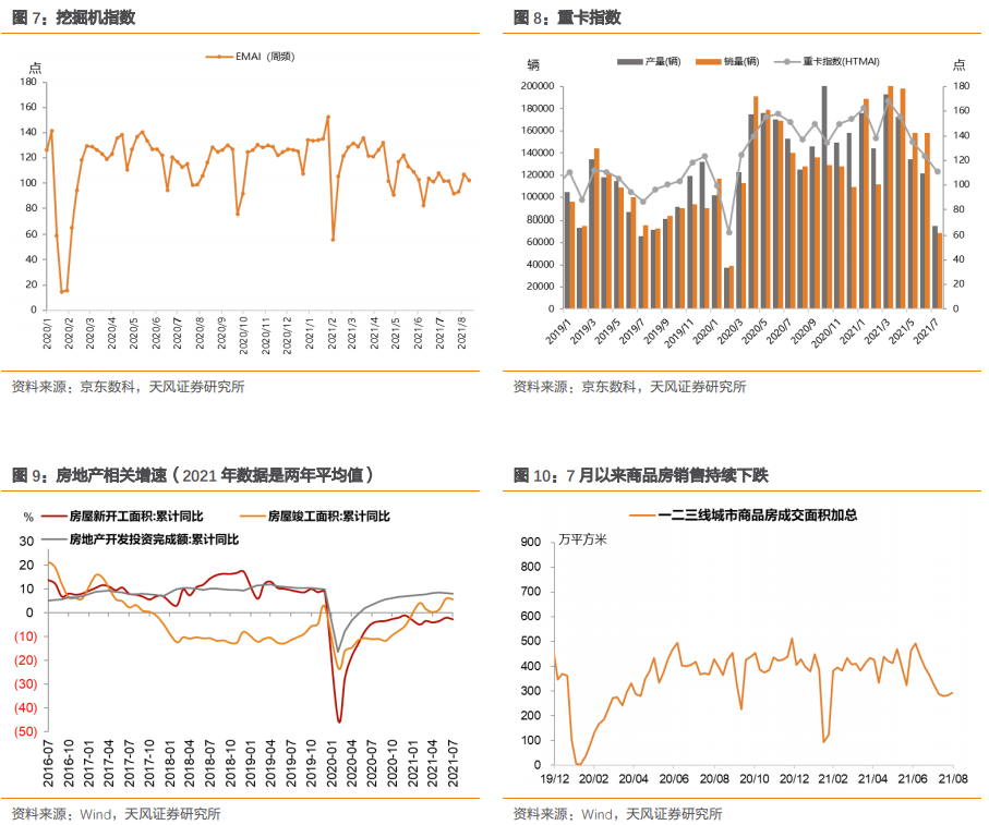 8月建筑业PMI有较大幅度回升,达到4月以来最高值,显示建筑业景气度有明显回升。从高频数据来看,各项数据仍有分化。螺纹钢价格先跌后涨,中枢回落;水泥价格季节性上涨,细分地区来看互有涨跌,主要受各地区疫情、天气、环保政策影响,总体来看项目开工率有小幅提升,随短期扰动因素消退,工程开工率仍有较大恢复空间[2]。从挖掘机和重卡指数来看,前者企稳回升,重卡则仍受“全面国六”标准影响,需求持续乏力。