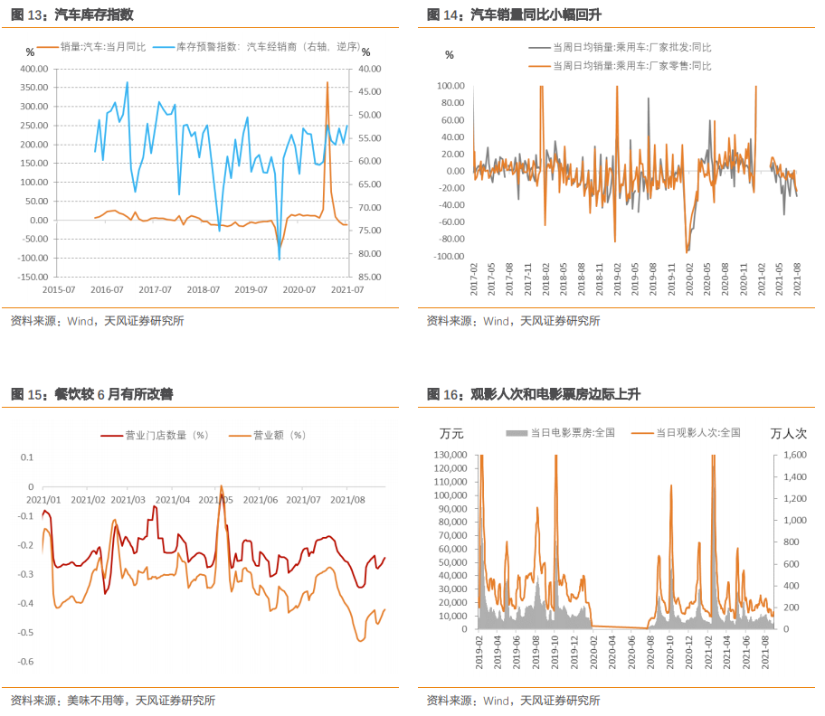 服务消费受疫情冲击较大。8月服务业PMI环比回落7.3个百分点至45.2%。此次多省多点疫情给尚处于恢复过程中的服务业带来较大冲击,抑制了接触型聚集型服务行业需求的释放。从电影票房和餐饮数据来看,8月消费确实出现较大幅度回落,但8月11日以来餐饮消费开始稳步回升,电影票房数据也已出现拐点,预计9-10月将有反弹。