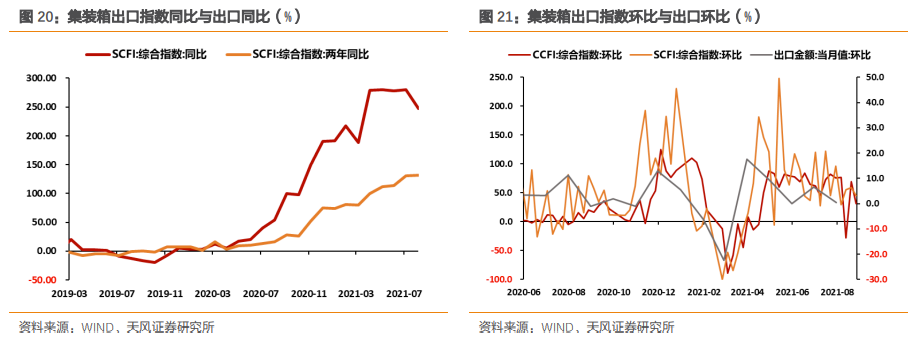8月SCFI的同比有所回落,两年同比继续维持高增速,8月SCFI与CCFI的指数环比均较7月高点有所回落,提示了7月出口增速有继续回落的可能。