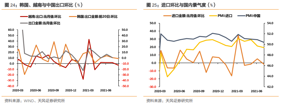 需要提醒的是,考虑到疫情与芯片缺口对越南、韩国出口的影响,两项指标对我国出口环比的指示性也可能减弱。