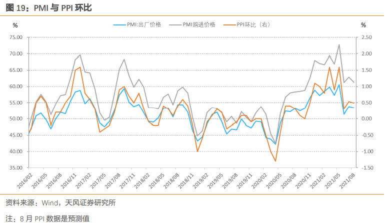8月出厂价格指数回落0.4个百分点至53.4%,主要原材料购进价格指数回落1.6个百分点至61.3%,价格指数虽有所回落,但仍处于较高区间。8月黑色、石化、有色等价格有明显回落,但纺织、化学原料及化学制品、非金属矿物制品等行业价格有所提升。综合来看,8月PPI环比约0.49%,同比约9.2%。