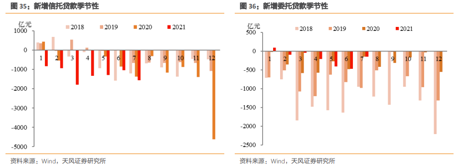 信托贷款方面,监管制定的2021年计划中要求“将行业融资类信托在去年的基础上再压缩20%”[2],今年前7个月信托贷款压降规模明显超季节性,我们判断8月信托贷款规模降幅可能有所放缓,预计下降500亿。
