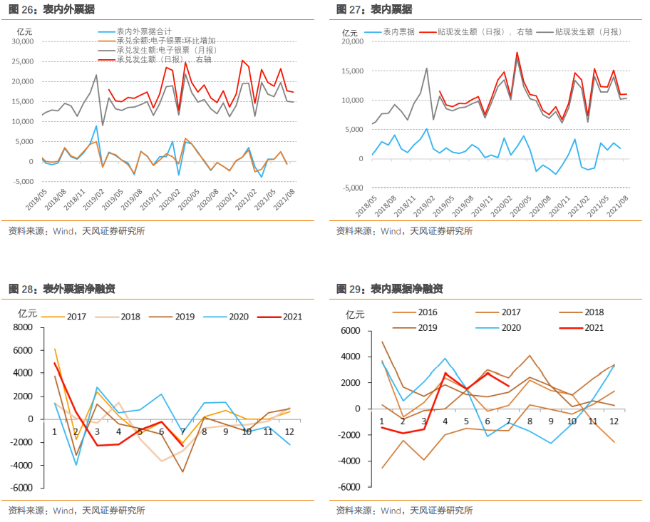 按照一般季节性,8月表内外票据环比均会有所增长。8月中上旬票据转贴现利率持续下行,或显示出当时商业银行(主要是中小银行)“以票充贷”的动力依旧强烈,直至23日央行召开金融机构货币信贷形势分析座谈会[1]后开始反弹,或指示后续信贷投放力度有所提升。结合8月票交所的开票数据,我们预计8月表内外净融资规模约为2500亿元。