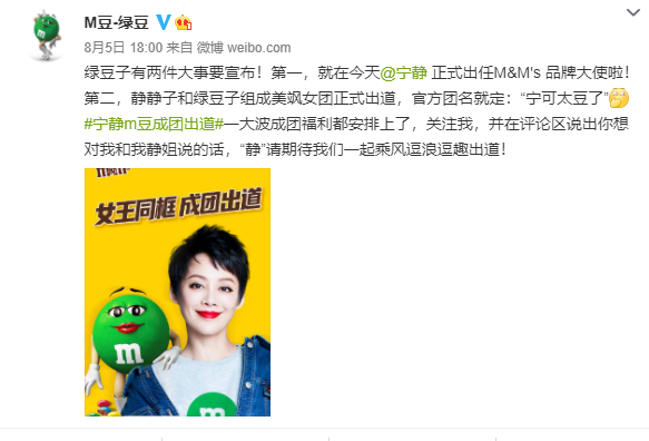 网友们玩梗玩的火热,M&M's也没有闲着。不久后,品牌直接官宣宁静成为M&M's品牌大使,并且表示静静子和绿豆子组成的美飒女团正式出道,官方团名就叫“宁可太豆了”。网友们得知,一边哈哈哈,一边表扬M豆反应迅速。通过这波快速接梗,也让M&M's这个巧克力品牌迅速提升了在消费者心中的好感度和知名度,可谓一举两得。