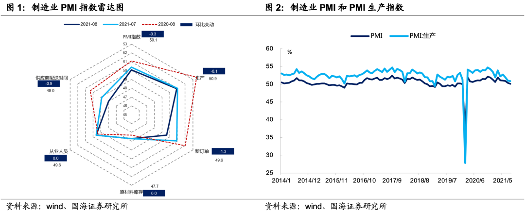 生产扩张延续放缓趋势。8月PMI生产指数为50.9%,较上月回落0.1个百分点,连续5个月处于回落区间。受江苏、河南等地局部疫情和南方省份洪涝天气的影响,叠加芯片短缺和限电限产现象持续,企业生产扩张延续放缓趋势。下一阶段,考虑到企业生产经营预期仍位于较高的景气区间,叠加雨季进入尾声和疫情的逐步控制,企业生产扩张或将出现一定的修复。