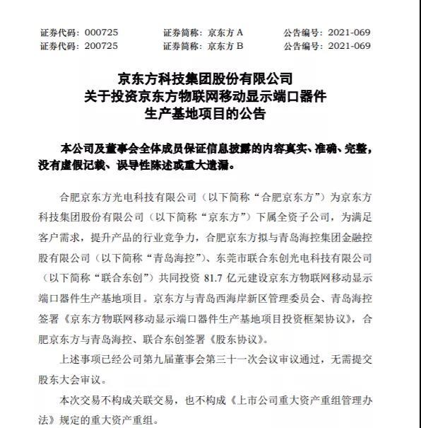 根据公告内容,京东方下属全资子公司合肥京东方拟与青岛海控、联合东创共同投资81.7亿元建设京东方物联网移动显示端口器件生产基地项目。