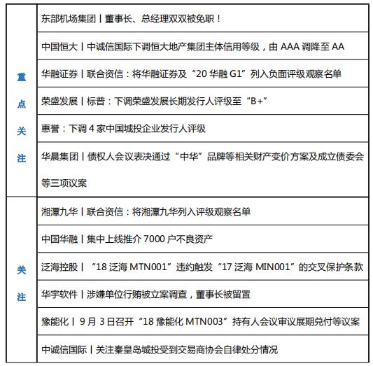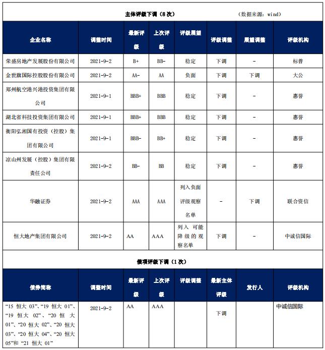 9月2日,中诚信国际将恒大地产集团有限公司主体信用等级由AAA调降至 AA,将“15 恒大 03”、“19 恒大 01”、“19 恒大 02”、“20 恒 大 01”、“20 恒大 02”、“20 恒大 03”、“20 恒大 04”、“20 恒大 05”和 “21 恒大 01”债项信用等级由 AAA 调降至 AA,并将主体和债项信用等级列入可能降级的观察名单。