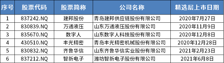 位于山东的挂牌公司,包括建邦股份、万通液压等在内共6家。