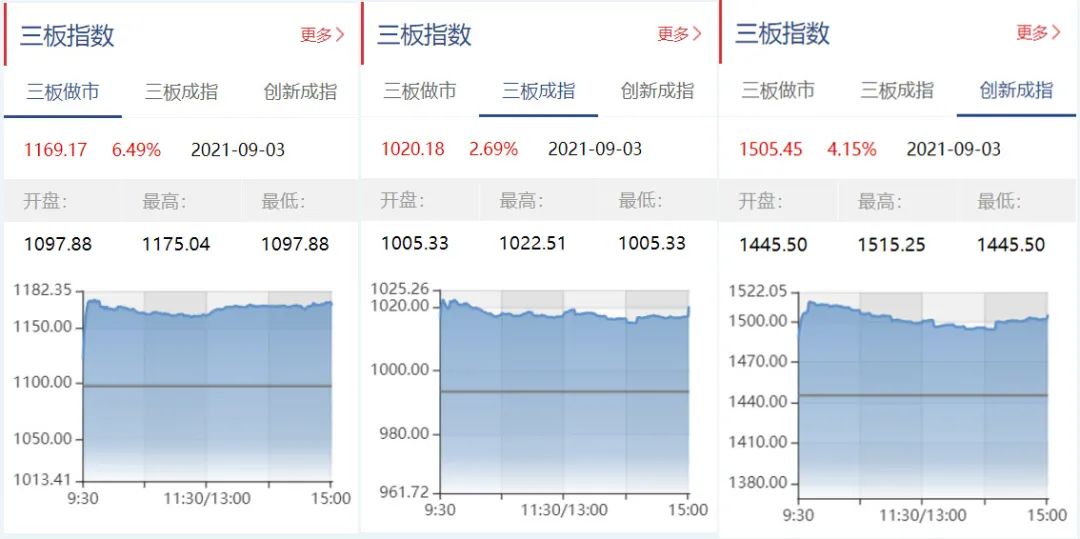 截至9月3日收盘,三板做市报1169.17点,上涨6.49%;三板成指报1020.18点,上涨2.69%;三板创新报1505.45点,上涨4.15%。