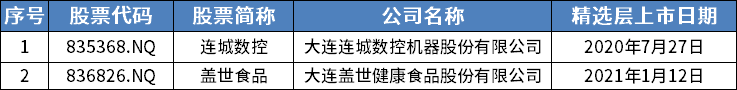 位于辽宁的挂牌公司,包括连城数控、盖世食品在内共2家。