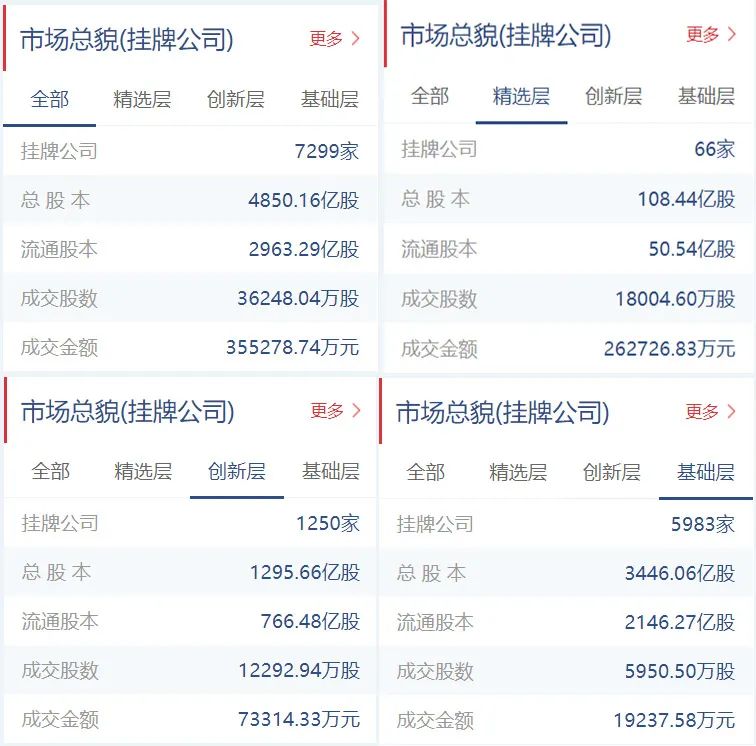 截至9月3日收盘,今日成交金额为35.53亿元,精选层成交金额为26.27亿元,创新层成交金额为7.33亿元,基础层成交金额为1.92亿元;今日成交股数为36248.04万股,精选层成交股数为18004.60万股,创新层成交股数为12292.94万股,基础层成交股数为5950.50万股。