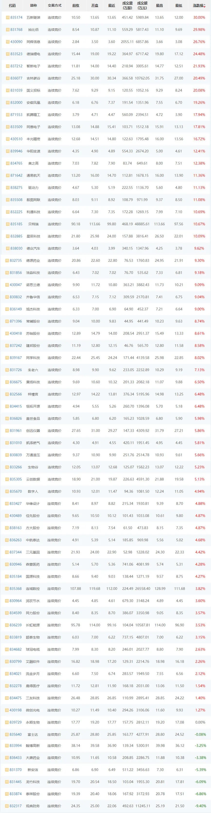 同时,同辉信息(430090)、德瑞锂电(833523)、智新电子(837212)、吉林碳谷(836077)、国义招标(831039)涨幅均超20%。此外,还有12家公司涨幅超10%。