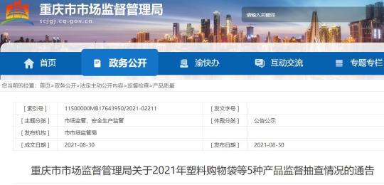 重庆市市场监督管理局网站近日公布《关于2021年塑料购物袋等5种产品监督抽查情况的通告》,按照《中华人民共和国产品质量法》等法律法规的相关规定,将2021年塑料购物袋、洗衣粉(含洗衣膏)、成品油、化肥、儿童及婴幼儿服装等5种产品监督抽查情况通告。