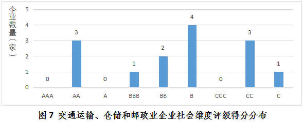 社会维度主要考察企业在员工权益和发展、供应链管理、客户权益保护、社区发展方面的信息披露情况,并以体现企业社会风险管理能力的社会领域负面舆情、企业员工伤亡作为负向指标,以社会领域的第三方正面评价作为加分项。2020年该行业整体社会维度的评级结果为BB级,评级分布表现最好,其中,评级最高的3家为AA级,分别为顺丰控股、中远海控、中国国航,AA级3家、BBB级1家、BB级2家、B级4家、CC级3家、C级1家。可以发现,交通运输、仓储和邮政业上市公司普遍注重客户权益保护与外部评价。