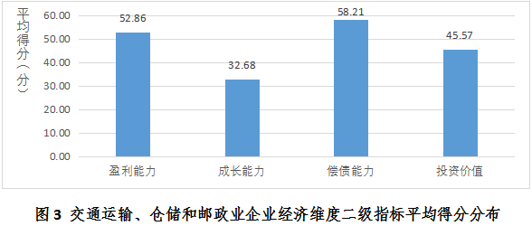 在经济维度二级指标中,盈利能力平均得分为52.86分,成长能力平均得分为32.68分,投资价值平均得分为45.57分,偿债能力平均得分为58.21分,最高得分为100分,最低得分为25分。这表明,交通运输、仓储和邮政业上市公司偿债能力整体表现良好,但差异较大。