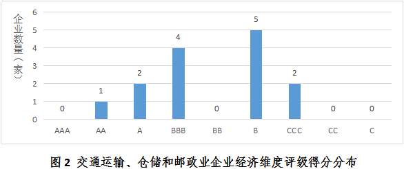 经济维度主要考察企业经营方面的经济绩效包括盈利能力、成长能力、偿债能力及投资价值。2020年该行业整体经济维度评级结果为BB级,其中,评级最高的AA级有1家,为招商轮船股份有限公司,A级2家、BBB级4家、B级5家、CCC级2家,行业经济维度评级整体表现良好。2020年受新冠肺炎疫情影响及特殊外部环境挑战下,交通运输、仓储和邮政业的偿债能力、盈利能力整体水平相对较好,行业龙头盈利能力表现突出。其中,顺丰控股持续发力全产业链局部,2020年顺丰控股净利润同比增长率23.2407%,高出同行最低值的企业68个百分点。可以看出,新冠肺炎疫情对交通运输、仓储和邮政业带来较大冲击,但“居家防疫”带动“线上消费”需求旺盛,催生物流与邮政业务量的上涨,带动相关企业业务收入持续上涨。