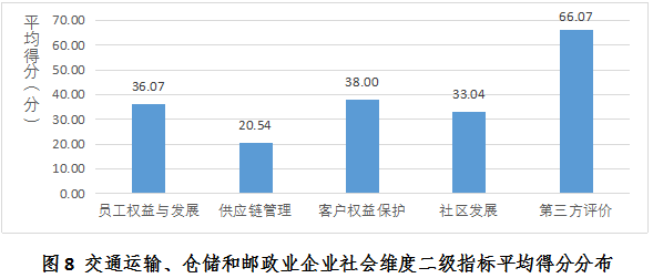 在社会维度二级指标下,第三方评价的平均得分为最高,得分为66.07分,其次为客户权益保护38.00分,员工权益与发展36.07分、社区发展33.04分,供应链管理平均得分最低,仅为20.54分(见图8)。可以看出,交通运输、仓储和邮政业上市公司较为重视客户权益保护,不断加强产品质量管理,提升服务能力、质量和水平,持续提升服务效率和客户满意度,为客户提供极致的服务体验。