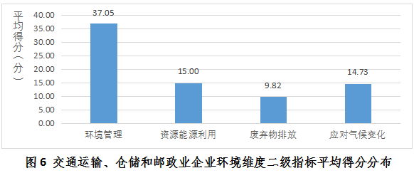在环境维度的二级指标下,环境管理平均得分为37.05分,资源能源利用平均得分为15.00分,应对气候变化平均得分为14.73分,废弃物排放管理为9.82分(见图6)。其中,废弃物排放最高得分为75分,最低得分为0分。这表明,交通运输、仓储和邮政业在废弃物排放等环境方面的管理水平差异较大,大多数企业仍需进一步增强环境风险管控意识,提升环境信息披露水平。