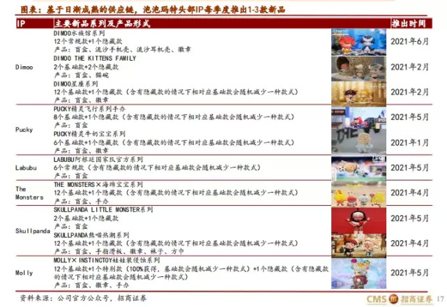 而泡泡玛特从设计草图完成后,交给工厂批量PVC化,经过开模、注塑、打磨、人工喷油、组装,到最后产出成品,将生产周期缩短至了三个月左右。2020年底,泡泡玛特签约供应链信息化公司富勒科技;2021年5月,泡泡玛特共推出15款新盲盒,达到近一年来的最高水平。