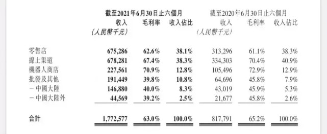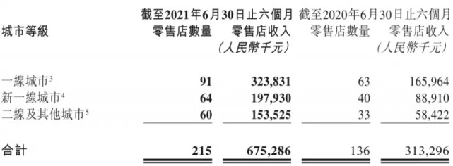 财报显示:从2019年的114家零售店,已发展至今年上半年的215家零售店。而零售店收入也从2020年上半年的3.13亿元增加至2021年上半年的6.75亿元,同比增长115.5%