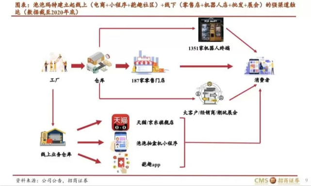 目前,泡泡玛特的收入主要来自零售店、机器人商店、在线渠道(天猫旗舰店、泡泡抽盒机及其他中国主流电商)、批发渠道和其他(经销商及批量采购的公司客户,以及潮流玩具展等)。