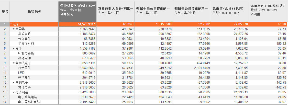 2021年上半年电子板块业绩表现不错,整个板块上市企业归母净利润总计同比增近93%至1016亿元。就细分领域半导体而言,归母净利润同比增幅达154%,其中主要得益于集成电路和分立器件业绩的上涨。