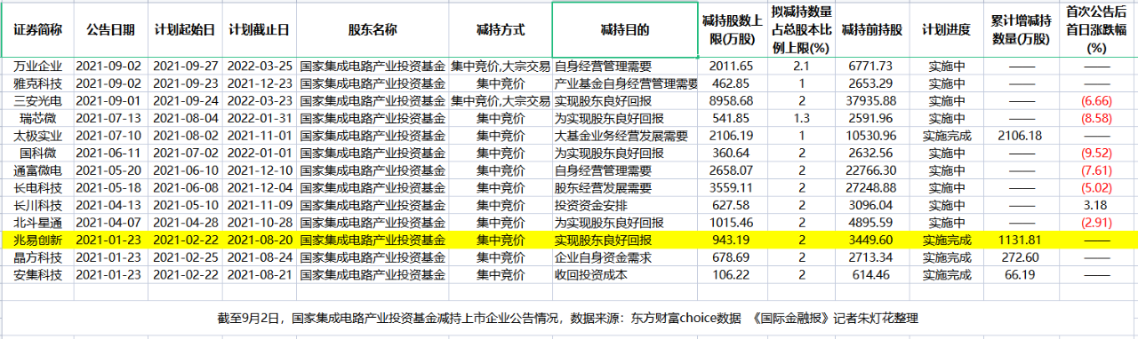 截至当前,大基金已通过集中竞价完成减持兆易创新、晶方科技、安集科技、太极实业4家企业股份,还有9家上市公司正在实施减持中。比如瑞芯微,大基金计划减持时间在2021年8月4日至2022年1月31日。