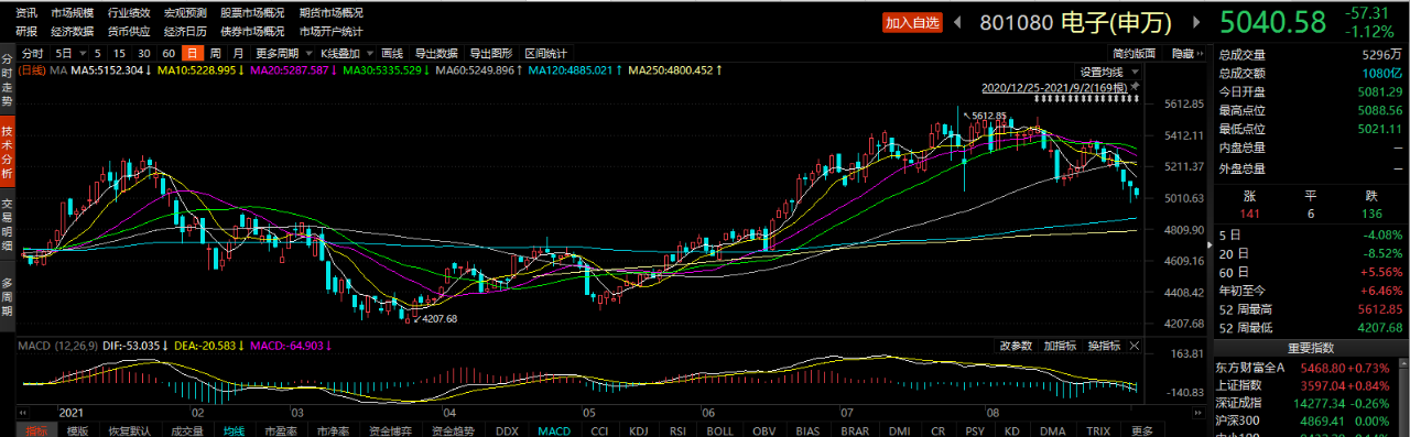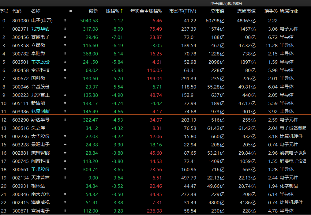 截至9月2日收盘,电子(申万)板块跌逾1%,北方华创跌幅超过8%报317.08元/股。半导体个股跌幅靠前,赛微电子、韦尔股份等7只半导体个股跌幅超过5%。