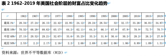 根据世界不平等数据库的数据,美国中产阶级和底层群体的收入占比由1980年的63.6%下降至2019年的54.2%,而富有阶层的收入占比由34.2%上升至45.46%,最富阶层的占比增长最快,即收入越来越多地集中到最富有阶层手中。