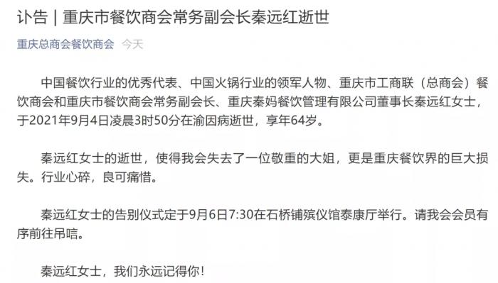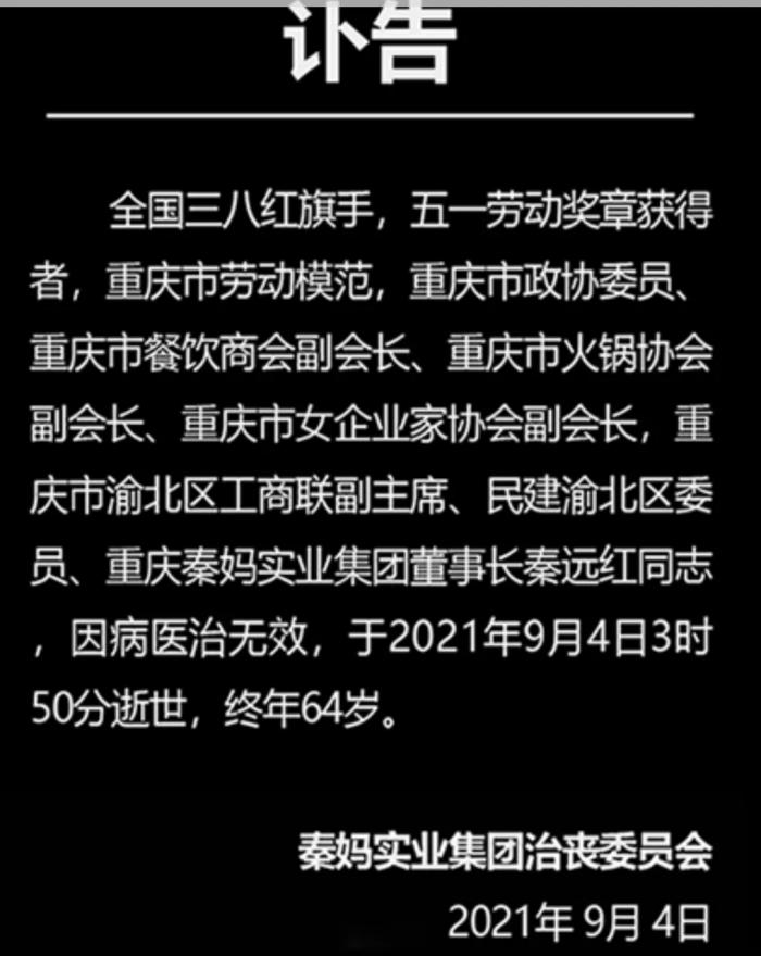 9月4日,秦妈实业集团治丧委员会发布讣告,全国三八红旗手、重庆市劳动模范、重庆市政协委员、重庆市餐饮商会副会长、重庆市火锅协会副会长、重庆秦妈实业集团董事长秦远红同志,因病医治无效,于2021年9月4日3时50分逝世,终年64岁。