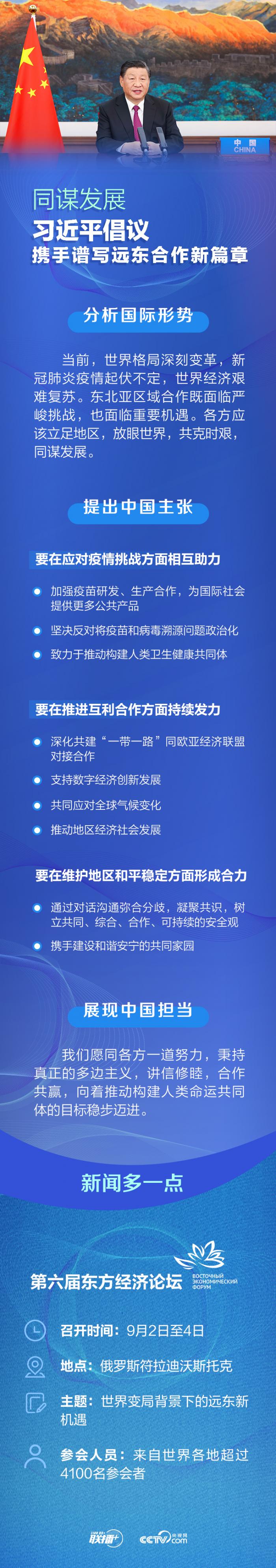 9月3日,习近平主席应邀以视频方式出席第六届东方经济论坛全会开幕式并发表题为《共克时艰,同谋发展 携手谱写远东合作新篇章》的致辞。