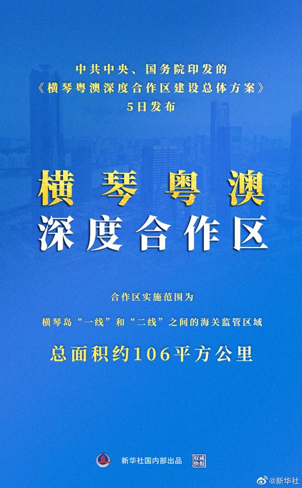 中共中央、国务院印发的《横琴粤澳深度合作区建设总体方案》5日发布。合作区实施范围为横琴岛“一线”和“二线”之间的海关监管区域,总面积约106平方公里。其中,横琴与澳门特别行政区之间设为“一线”;横琴与中华人民共和国关境内其他地区之间设为“二线”。根据横琴全岛客观现实情况,对合作区进行分区分类施策管理。这是丰富“一国两制”实践的重大部署,是为澳门长远发展注入的重要动力,有利于推动澳门长期繁荣稳定和融入国家发展大局。