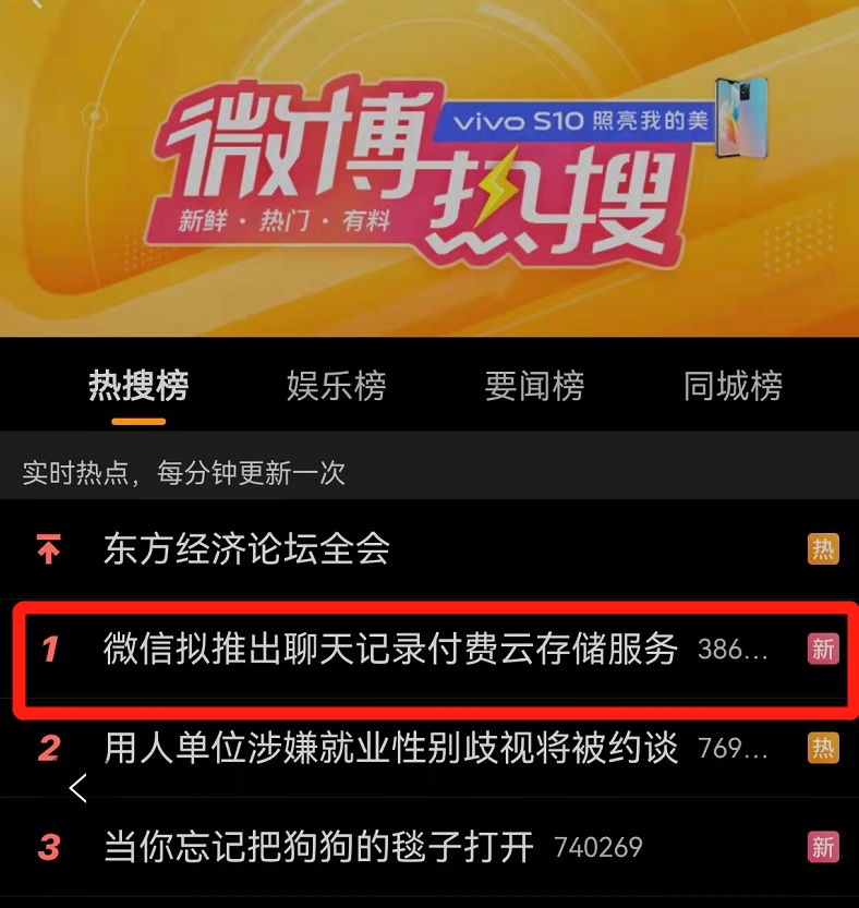 大周末的,一则关于#微信拟推出聊天记录付费云存储服务#的消息突然冲上微博热搜首位。