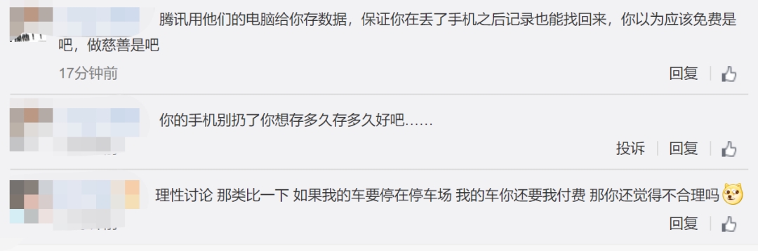 此外,还有网友表示理解:认为腾讯用他们的电脑给你存数据,保证你在丢了手机之后记录也能找回来,付费是正常的。