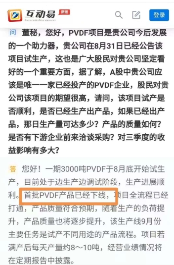 而就在今日上午,公司在深交所互动平台上透露,目前生产进展顺利,首批PVDF产品已下线,项目全流程已经打通,产品质量符合预期。公司称随着产能负荷提升,产品质量也将逐步提升,项目若满产每天产能为8-10吨。