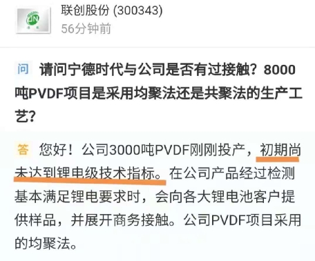 不过,公司表示,目前试生产的产品主要用于涂料及3C产品,尚未达到光伏及动力锂电级别。经公司初步测算,预计到2021年12月31日止,该生产线可产出PVDF(聚偏氟乙烯)600-800吨。