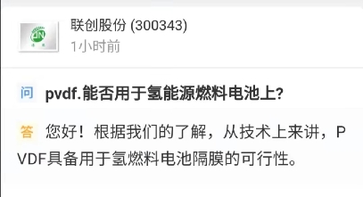 此外也有投资者问及公司的PVDF是否能应用于氢燃料电池,公司称“从技术上讲,PVDF具备用于氢燃料电池隔膜的可能性”。