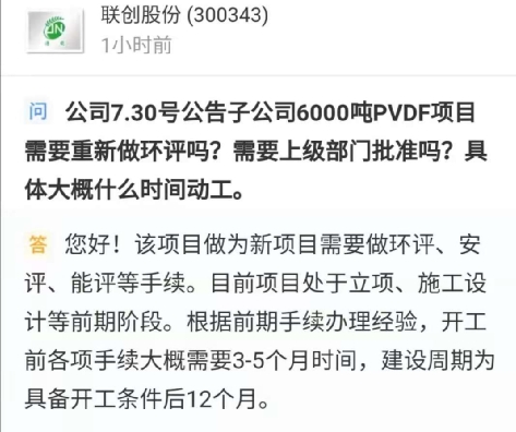 联创股份在互动平台表示,目前该新项目处于立项、前期施工设计阶段,前期手续大概需要3-5个月,建设周期为具备开工条件后12个月。