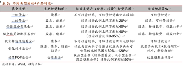 从广义的角度来看,“固收+”并无一个明确的区隔,市场上可以归为此类的产品有:混合债券型一级基金(简称“一级债基”)、混合债券型二级基金(简称“二级债基”)、偏债混合型基金、低仓位灵活配置基金、积极投资可转债的中长期纯债型基金、量化对冲基金、偏债FOF基金。
