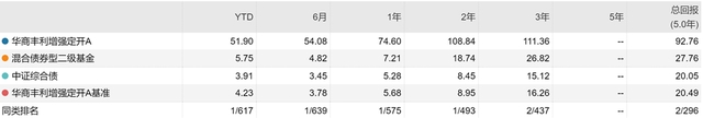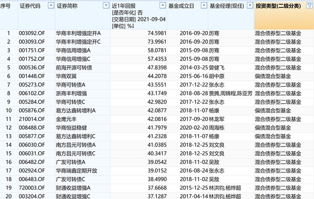 其中,第一的华商丰利增强定开A成立于2016年9月,近一年收益率为74.60%。
