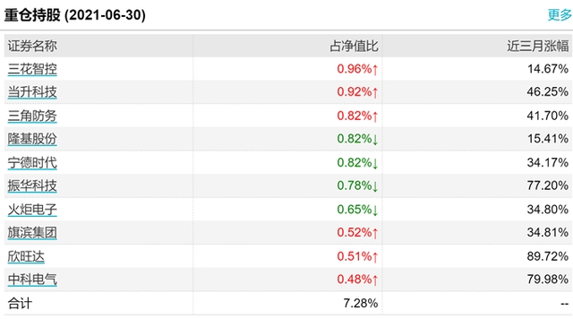 十大重仓股包括三花智控、当升科技、三角防务等。