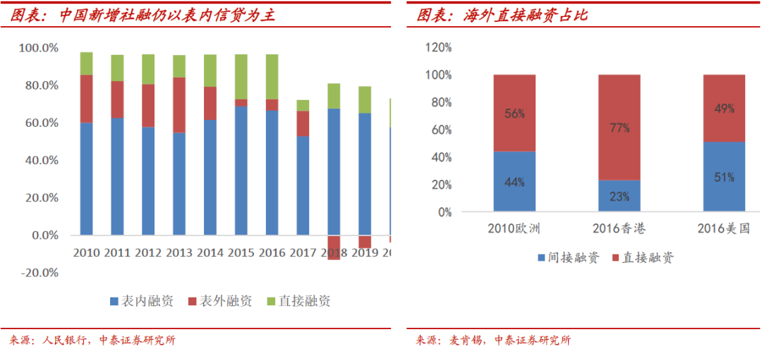 我国融资结构处在拐点,背后是经济结构转型升级。过去我国间接融资占比一直处于高位,其核心原因是中国经济发展模式长期以来是基建、地产拉动,对应的融资方式是银行贷款。目前经济总量增速下降,而未来经济发展不走地产基建刺激的老路,切换为以消费科技等新兴行业拉动,直接融资更适应新经济发展模式和结构。
