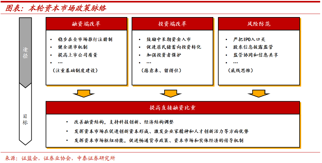 政策背景:金融监管的“二元化”时代——“市场化”发展权益市场的大时代。我们认为金融监管思路已比较清晰,而且持续性强,呈现“二元化“监管特征。1、对于传统贷款业务(非标),“行政化“色彩较浓;对应的经济目标是稳住存量经济。未来对贷款投向、贷款利率、存款利率仍然会有行政化指导,目的是保持经济平稳,同时降低系统性风险。2、对于权益市场, “市场化“发展;对应的经济目标是增量经济,及经济结构转型。政策希望IPO、再融资不断推进,尤其是新兴行业;必须采取市场化手段发展:”建制度、零容忍、不干预“ ,融资结构的持续变化,从而推动经济结构转型和升级。