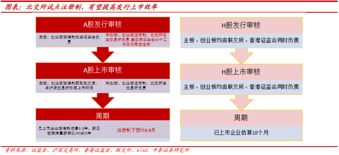 北交所试点注册制,审核效率提升。参照科创板、创业板,北交所企业上市由北交所审核、证监会注册。目前科创板已上市企业平均周期8.7个月,预计北交所初步预期的审核周期在6-9个月,相比此前新三板退市再次排队IPO周期将显著缩短。北交所总体程序与科创板、创业板类似,北交所收到注册申请文件后,在五个工作日内作出是否受理的决定,受理注册申请文件之日起两个月内形成审核意见,证监会在北交所审核通过后20个工作日内完成注册,提升了企业注册发行上市的效率。同时设置北交所上市委员会与行业咨询委员会,发挥监督制衡作用、提供专业咨询意见,持续健全我国多层次资本市场结构,优化资本市场投资效率。