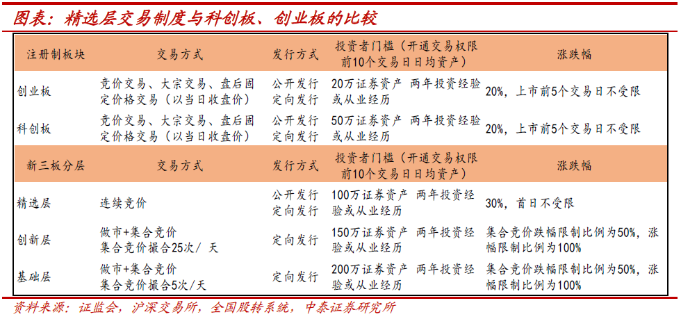 交易制度:总体与精选层内容保持一致,减持更为灵活,期待投资者适当性优化