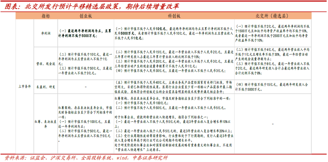 从上市制度角度看:继续秉承“包容性原则”,服务“小而美”企业。维持与新三板创新层、基础层“层层递进”的市场结构,北交所发行主体为在新三板挂牌满12 个月的创新层公司;参考目前精选层标准,以市值为核心的指标体系和财务指标经营条件,市值区间为>=2亿至>=15亿元,对于市值15亿及以上,未设置盈利要求,要求最近两年研发投入合计不低于5000万元,相比科创板、创业板最低市值10亿或有盈利要求,进一步拓宽了对创新型中小企业覆盖面、构建有别于沪深交易所的发行上市制度安排;参考科创板、创业板,我们预计后续或对于红筹架构、存在表决权差异企业、上市公司子公司孙公司分拆上市等领域有望进行相应政策安排,吸引更多优质企业。